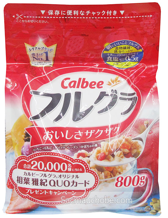 - Ngũ cốc Calbee với thành phần được làm từ yến mạch, lúa mạch, lúa mỳ và các loại trái cây sấy khô (dâu tây, đu đủ, táo, nho, hạt bí, hạnh nhân, dừa, ngô)